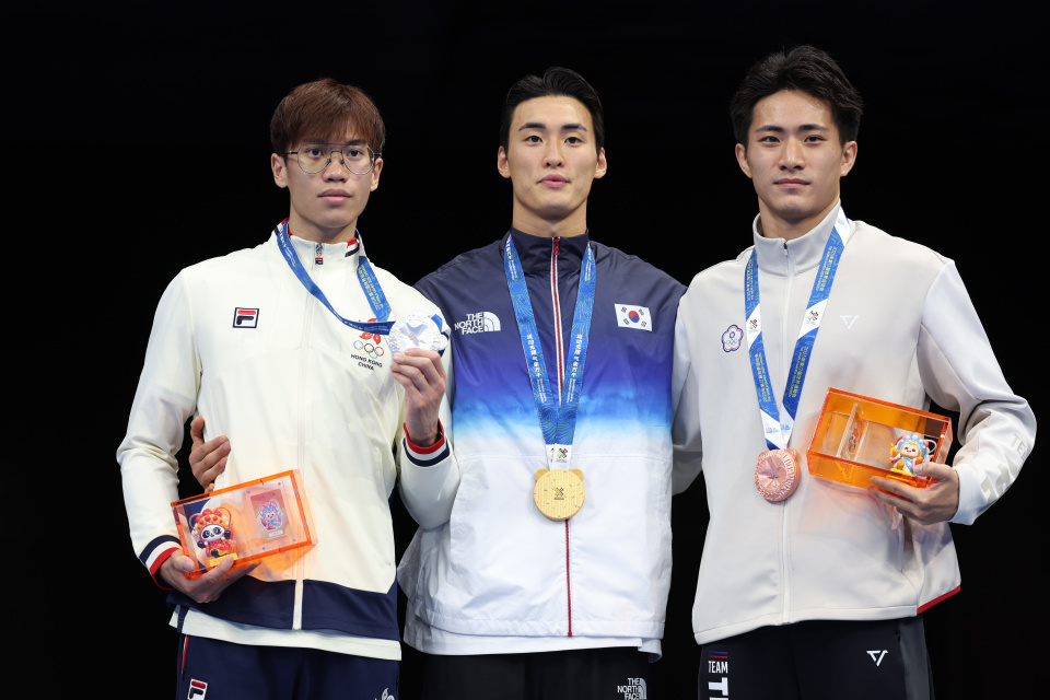 8月12日,冠军韩国选手宋起哲(音、中)、亚军中国香港选手张溢霖(左)和季军中国台北选手张焕宜在领奖台上合影。新华社记者 陈斌 摄